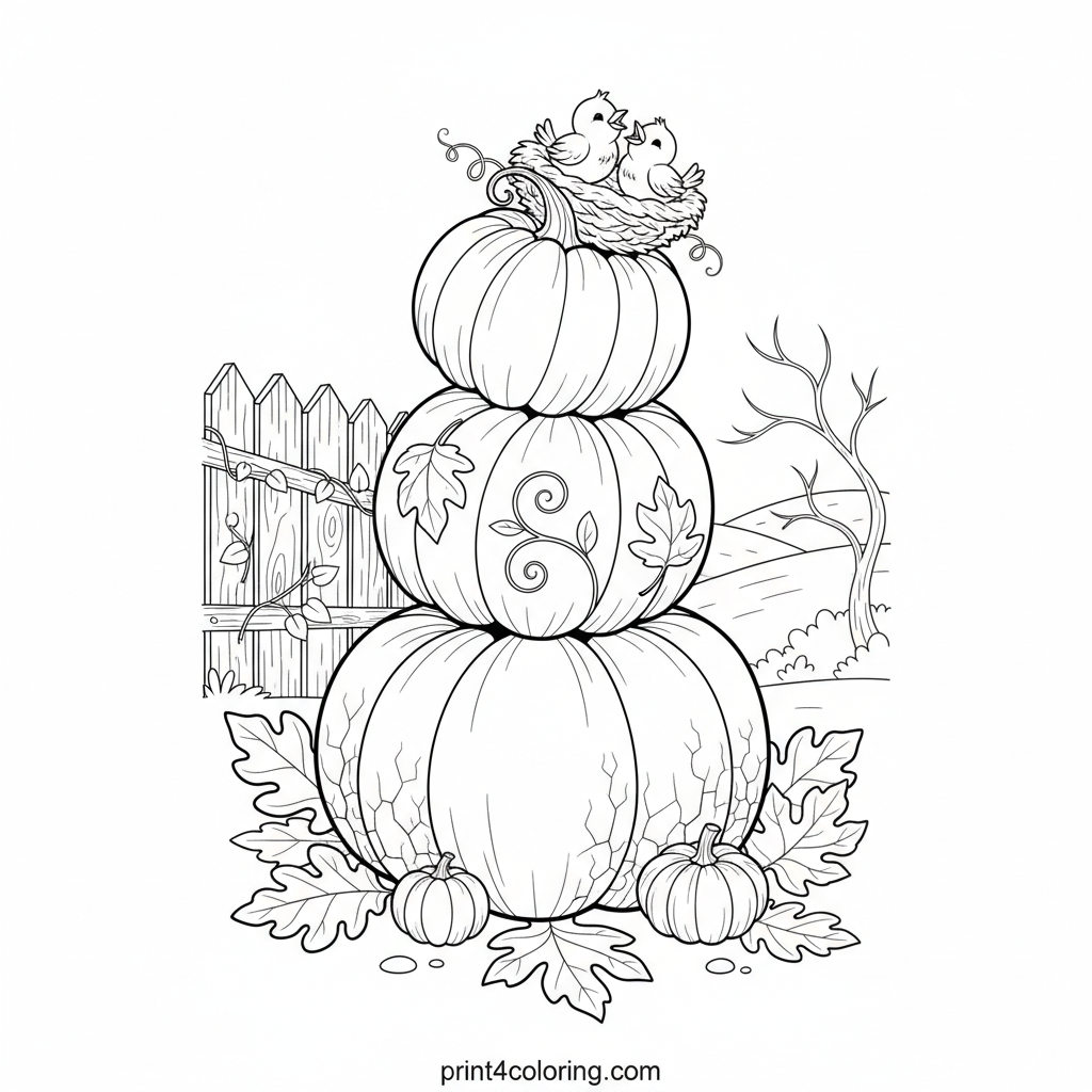 Imagine a delightful tower of three friendly pumpkins, each one smiling! At the very top, a tiny bird's nest cradles two adorable baby birds, peeking out from their cozy home. This charming scene invites you to bring it to life with your favorite colors, adding warmth and wonder to a perfect autumn day.