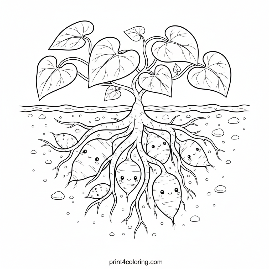 Explore the amazing hidden world beneath the soil! This cozy coloring page reveals a yam plant's intricate root system, where delicious yams are growing. Color the earthy textures of the soil and the graceful vines above ground. Discover the secret life of this wonderful plant, perfect for expert colorists.