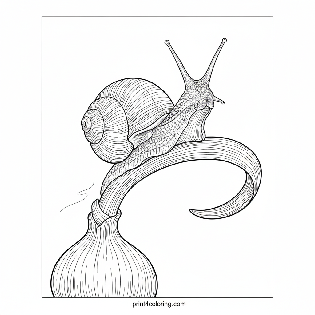 Explore the hidden world of your garden with this intricate coloring page! A tiny, curious garden snail embarks on a slow journey up a majestic onion leaf, leaving a shimmering trail. Discover the rich textures of the onion bulb and its graceful greens in this detailed close-up portrait, perfect for patient colorists.