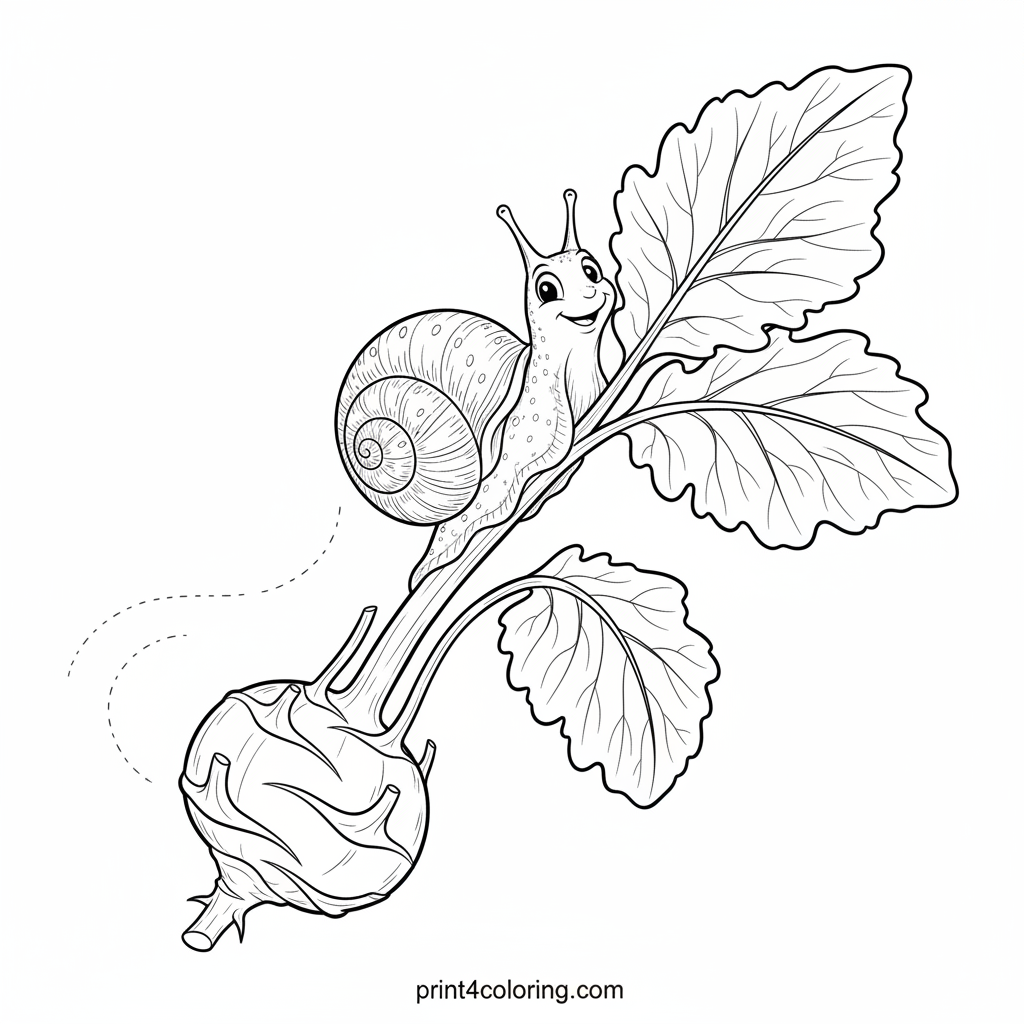 Watch a cheerful garden snail on an epic journey up a plump kohlrabi plant! This detailed scene showcases the snail's textured shell and glistening trail as it slowly climbs a sturdy stem. Explore the intricate leaf veins and enjoy bringing this gentle moment of nature to life with your favorite colors.