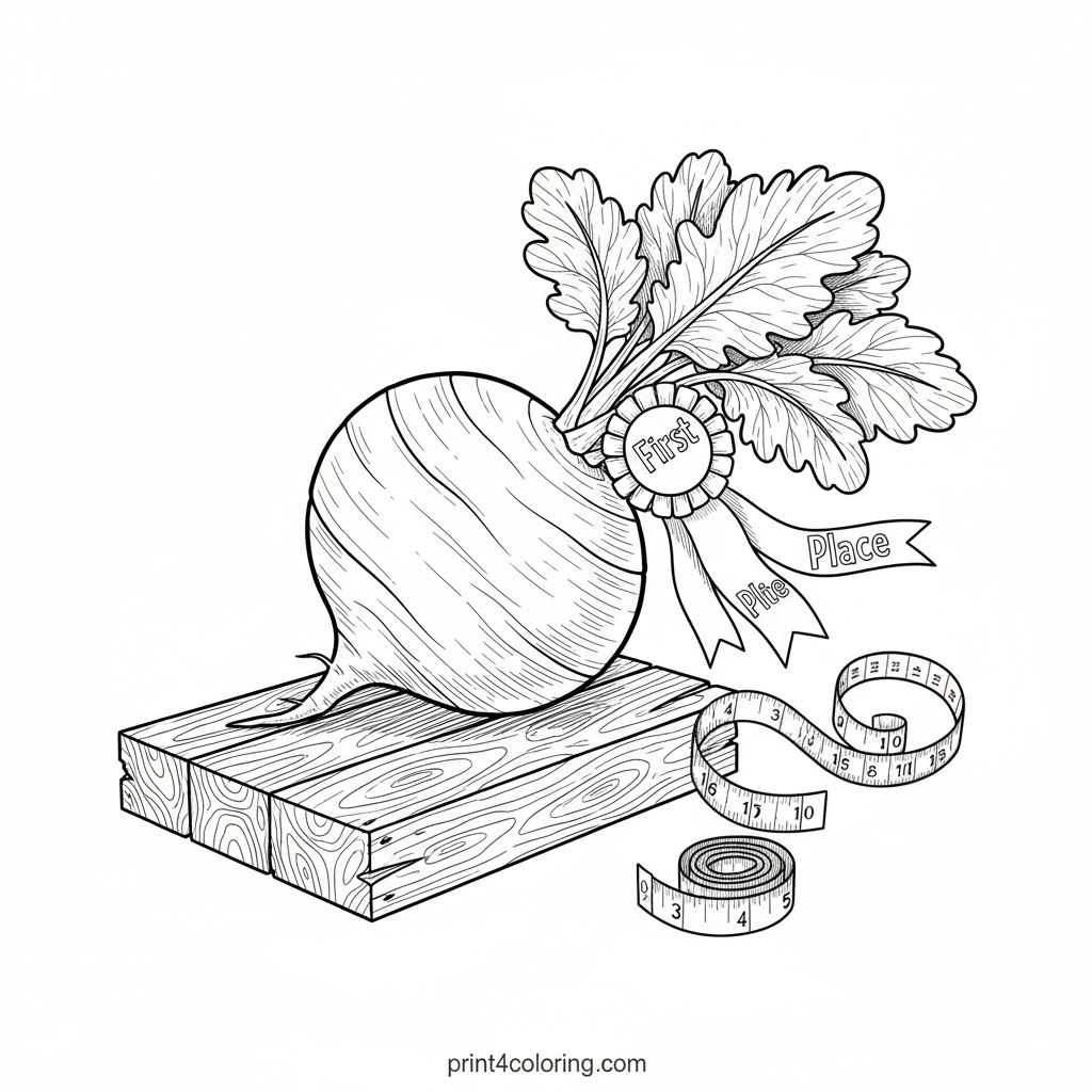 Step into the bustling world of a country fair with this expert coloring page! Discover a magnificent, prize-winning turnip, so perfectly grown it earned a 'First Place' blue ribbon. It rests proudly on a rustic stand, a measuring tape beside it. Bring this farm champion to life with your most vibrant colors!