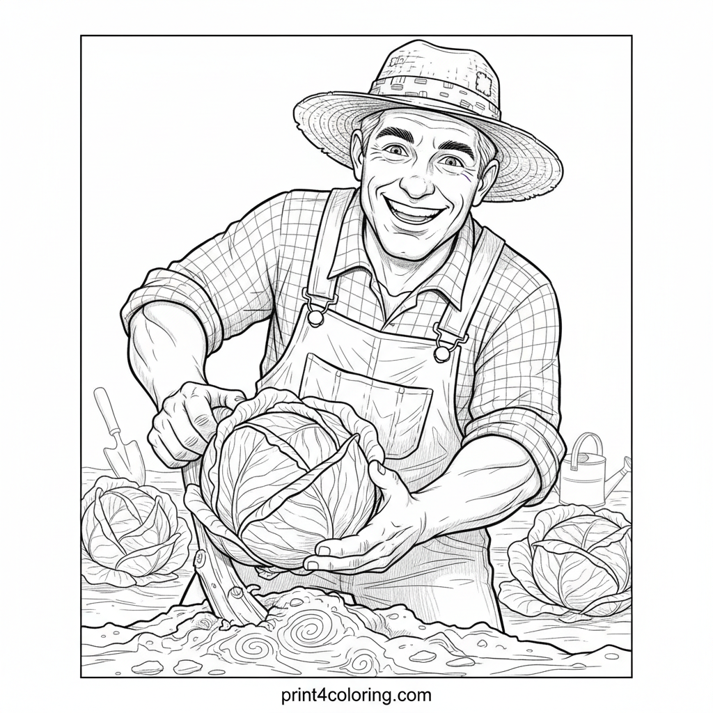Join our cheerful farmer as they expertly pull a giant, crisp cabbage from the garden's rich soil! This detailed scene shows the hard work and joy of harvest time, with other vegetables waiting to be picked and trusty tools nearby. Get ready to add vibrant colors to this bustling garden adventure!