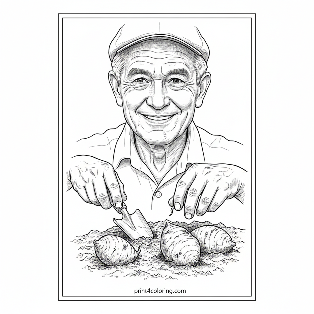 Join a friendly farmer on a close-up adventure, carefully digging in rich soil to unearth delicious yams! This detailed scene highlights the bumpy textures of the yams and the earthy feel of the garden. A perfect page for exploring nature's bounty and careful hands.