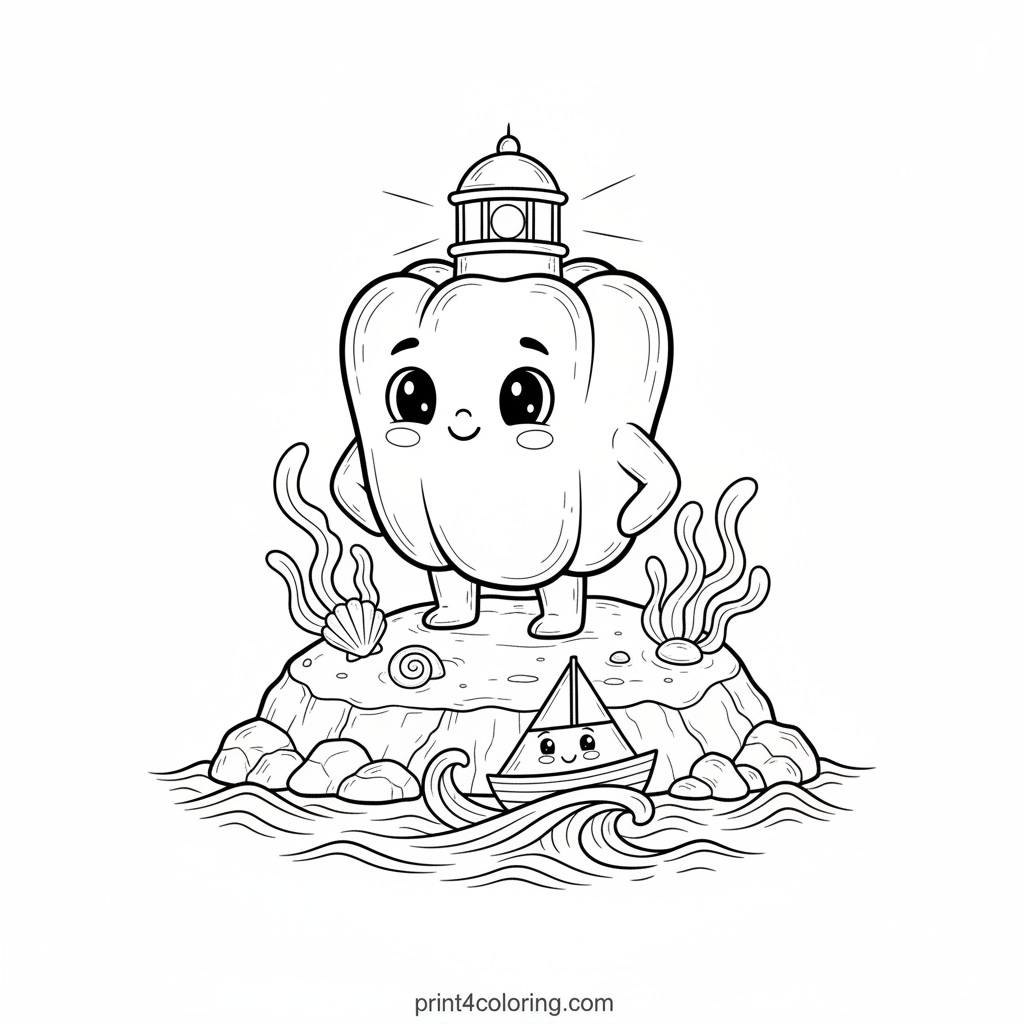 A tall, vibrant red bell pepper stands proudly on a detailed rocky outcrop, cleverly transformed into a charming lighthouse, complete with a tiny, glowing light. A friendly sailboat gently bobs on calm waves below, with seashells and seaweed visible on the rocks. A truly cozy and imaginative scene to color!