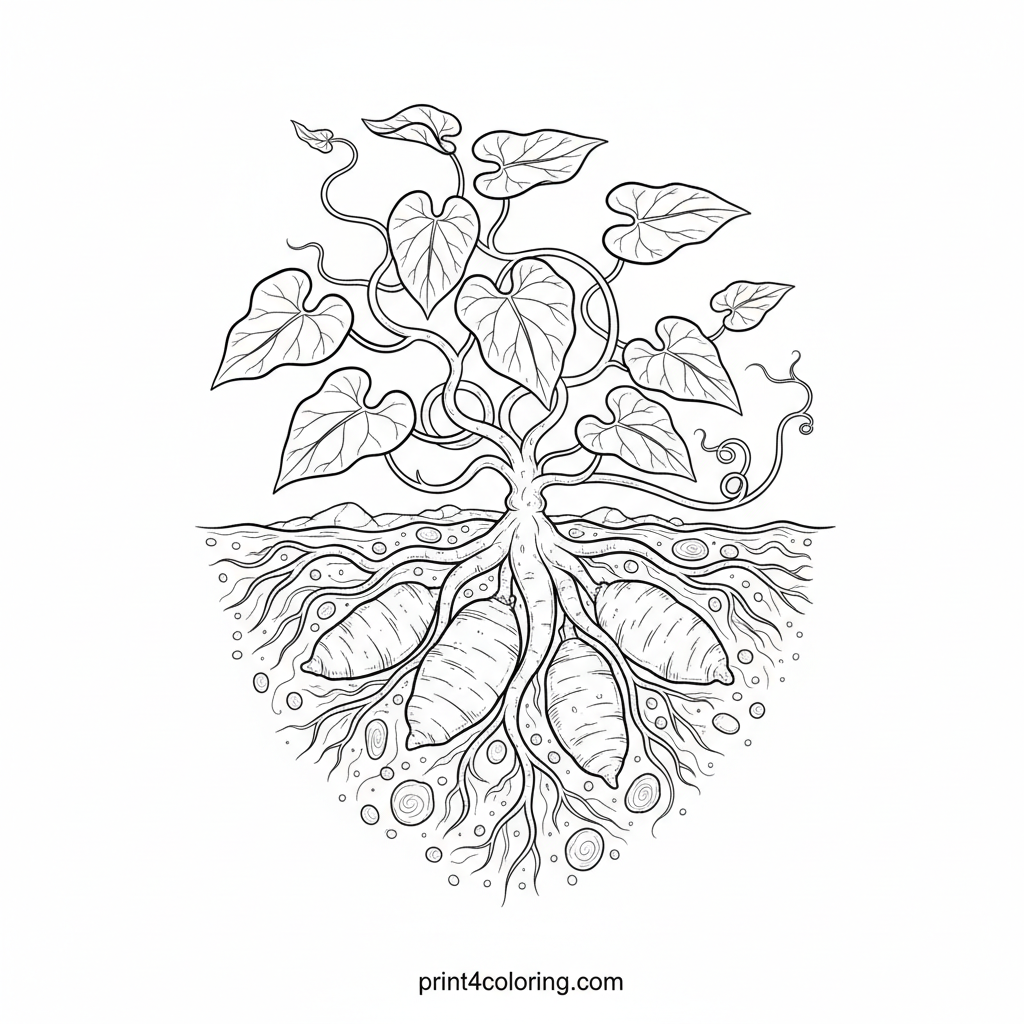 Dive deep into the earth to discover the hidden wonders of a yam plant! This detailed coloring page reveals an intricate cross-section, showing robust roots, developing yams nestled in textured soil, and vibrant green vines stretching above ground. A fascinating botanical adventure awaits your colors!