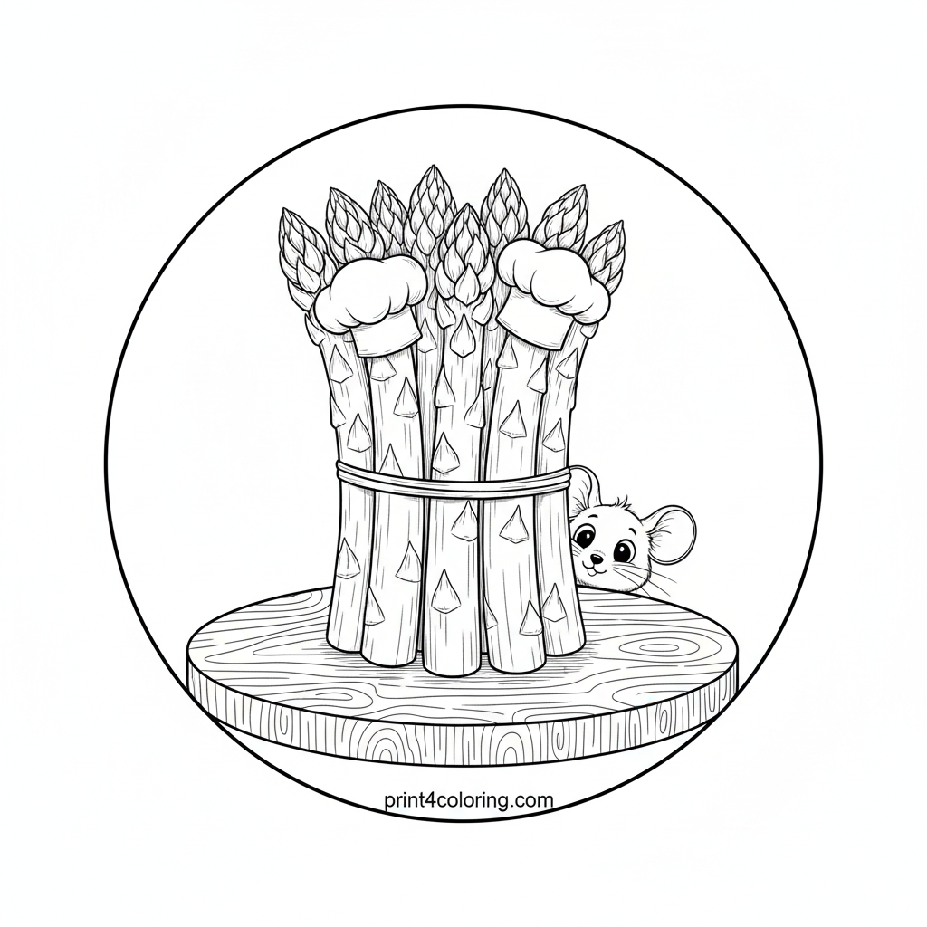 Step into a cozy kitchen scene where fresh asparagus spears, wearing tiny chef hats, stand proudly on a rustic cutting board. A curious little mouse peeks from behind, adding to the charm. This detailed page invites you to explore rich textures and bring this adorable culinary adventure to life with your favorite colors.