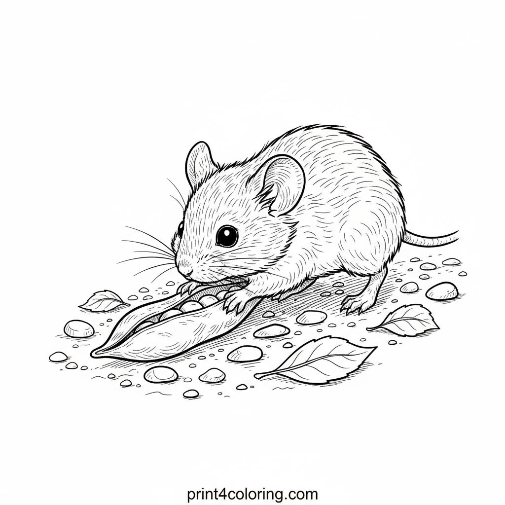Join a delightful little field mouse as it embarks on a grand adventure in the garden! With bright, curious eyes and a tiny paw, our fluffy friend is carefully investigating a mysterious fallen pea pod. Imagine the wonders hidden within as you color the detailed fur, rich soil, and tiny leaves of this enchanting garden scene.
