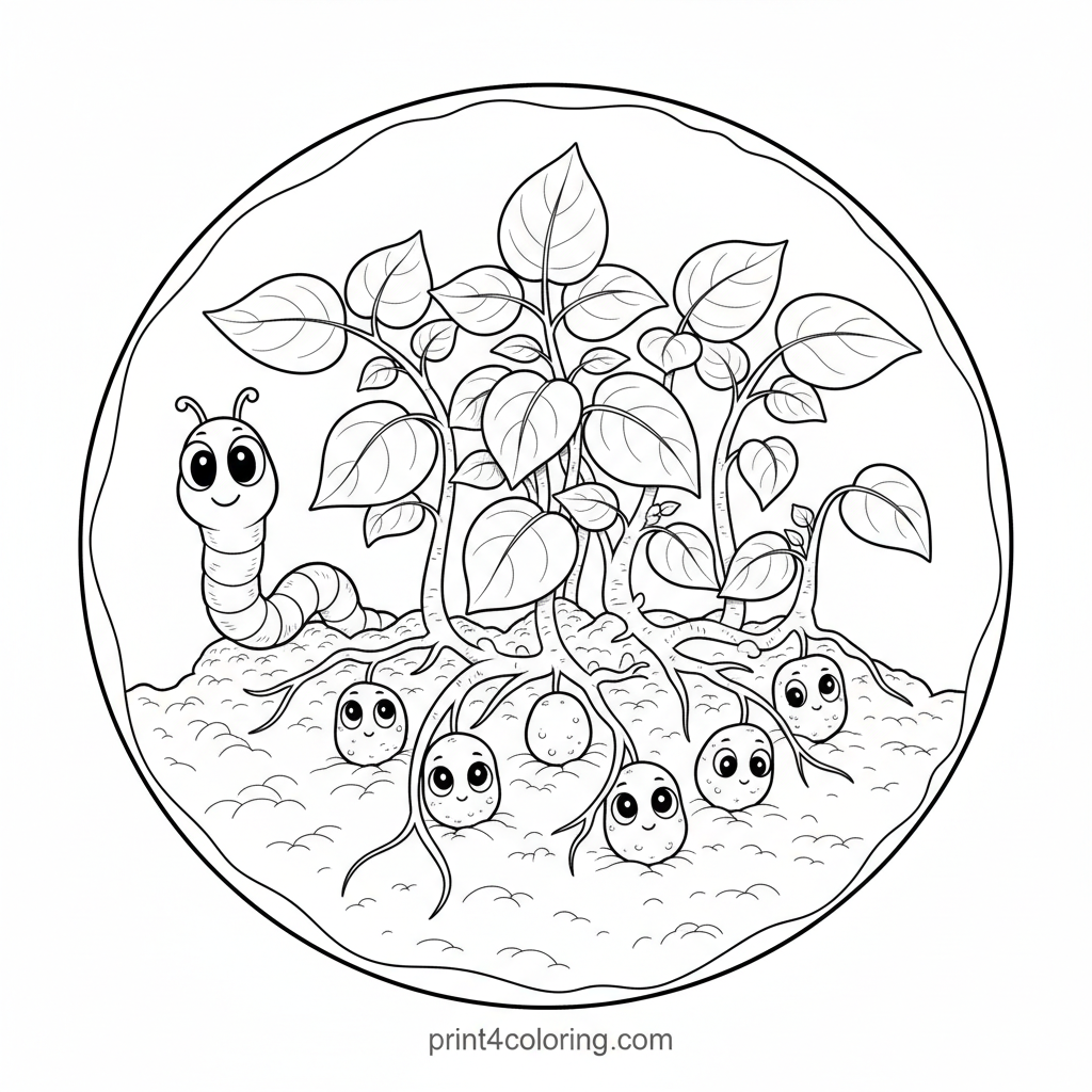 Dive into the charming world beneath the soil! This detailed coloring page showcases young potato plants with intricate roots and tiny developing potatoes nestled in rich, textured earth. A friendly earthworm peeks out, inviting you to explore nature's hidden wonders and bring this cozy, spud-tacular scene to vibrant life.