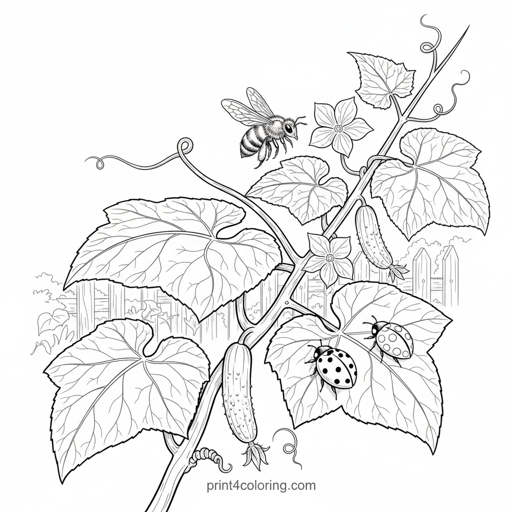Immerse yourself in the detailed world of a flourishing cucumber vine! Observe broad, veined leaves, delicate tendrils, and developing cucumbers. A friendly ladybug perches on a leaf, while a busy honeybee visits a flower. Hints of a garden fence complete this vibrant, natural scene, ready for your artistic touch.