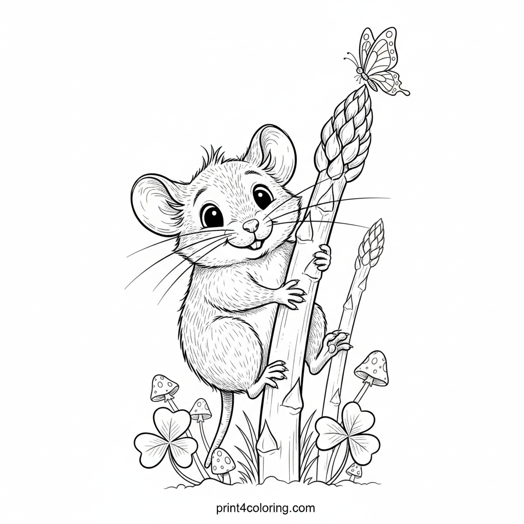Dive into a magical miniature world where elegant asparagus spears stand tall as trees! A brave little field mouse scales one, while a beautiful butterfly rests on another. Discover lush clovers and tiny mushrooms dotting the whimsical forest floor. A delightful scene for detailed coloring!