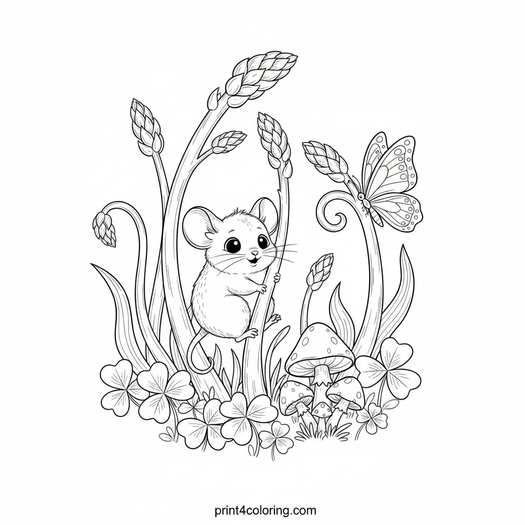 Step into a charming miniature world where elegant asparagus spears form a whimsical forest! A busy field mouse skillfully climbs a leafy spear, while a delicate butterfly rests nearby. Discover tiny, detailed mushrooms and lush clovers on the forest floor, waiting for your creative colors to bring this cozy botanical scene to life.
