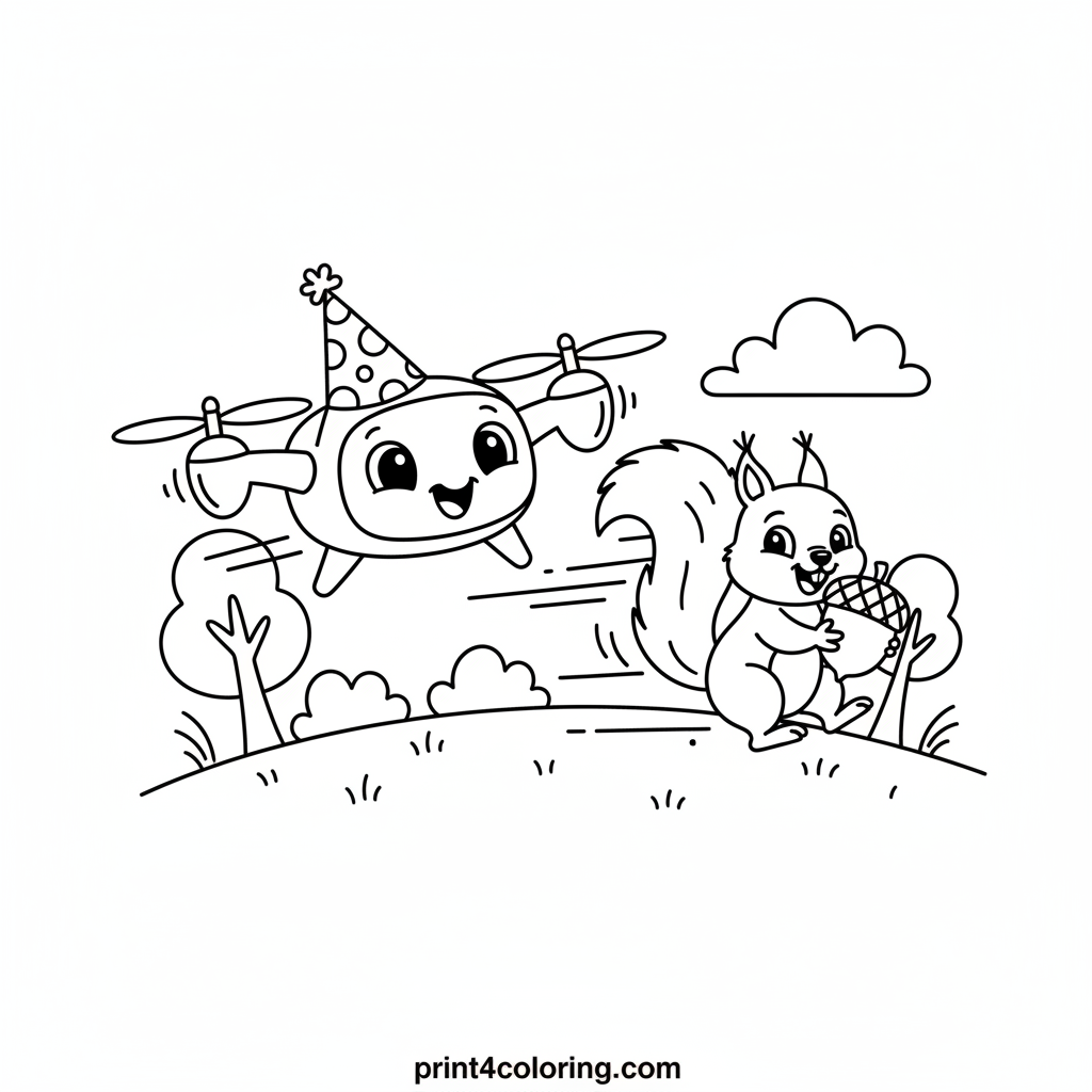 Join a joyful squirrel, clutching his prized acorn, as he's playfully chased by a cheerful drone wearing a tiny, wobbly party hat! This delightful scene captures a moment of pure fun and friendship, perfect for little artists to bring to life with vibrant colors. Imagine the laughter as they dash through the park!