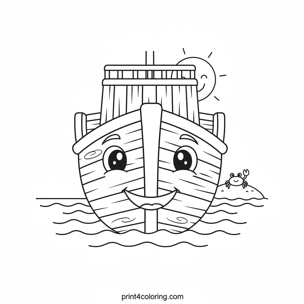 Set sail for fun with Captain Cutie's friendly pirate ship! This cheerful vessel, complete with big, kind eyes, glides gently on wavy blue waters under a bright, sunny sky. A cute little crab waves a claw from a nearby sandy island, ready to greet our happy adventurers. Get ready to color this delightful scene!