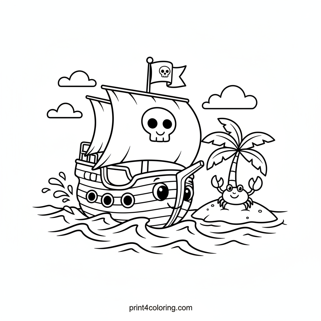 Set sail for adventure with this cheerful pirate ship! Featuring big, friendly eyes on its bow, this happy vessel glides across gentle blue waves under a bright, sunny sky. A tiny, sandy island is nearby, where a cute little crab waves hello. Grab your crayons and bring this sunny sea scene to life!