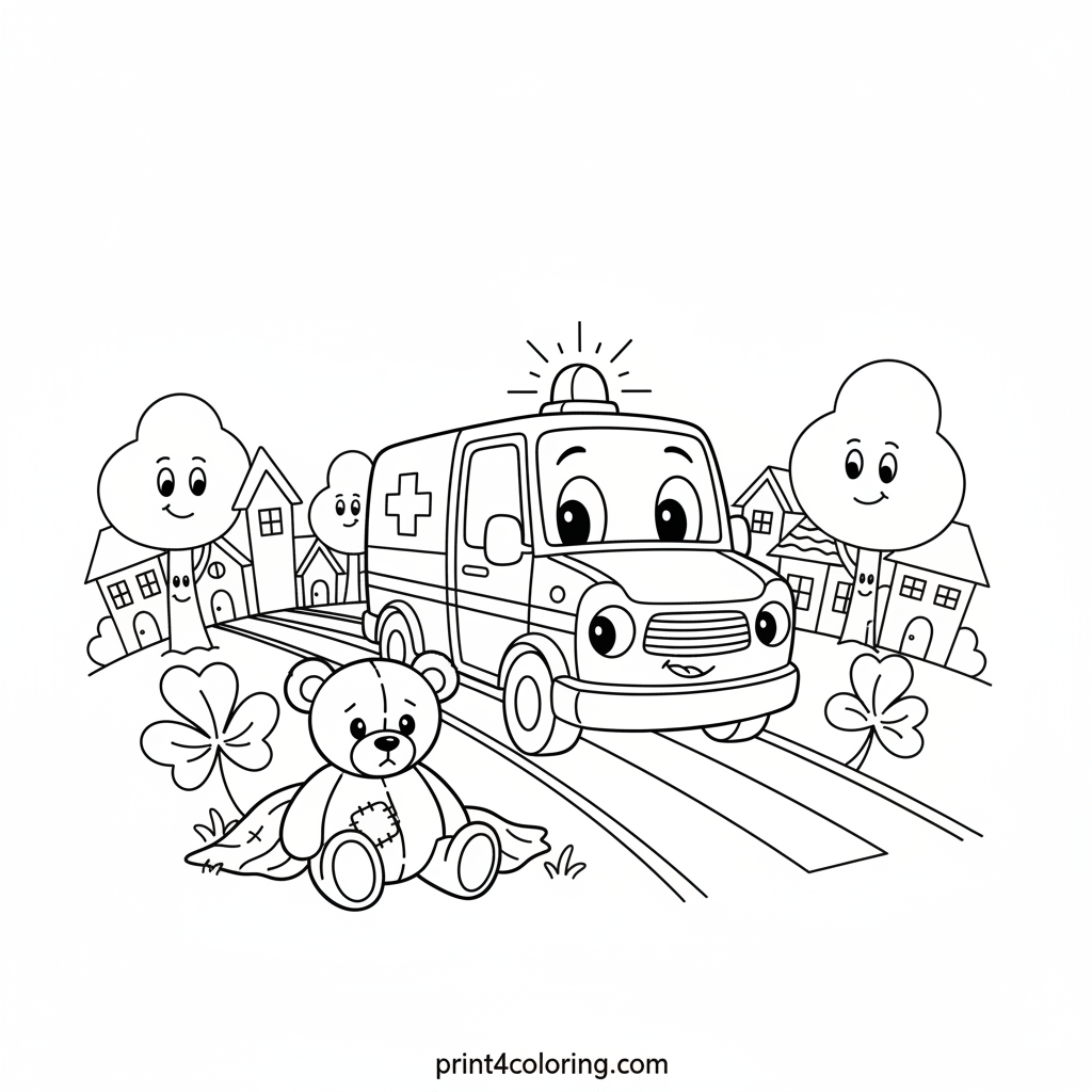 Join our cheerful ambulance on a very important mission! It's driving along a winding road past happy houses and green trees, with its siren light softly glowing. Help this brave vehicle reach the friendly teddy bear who needs a little care. Get ready to color a heartwarming scene of helping!