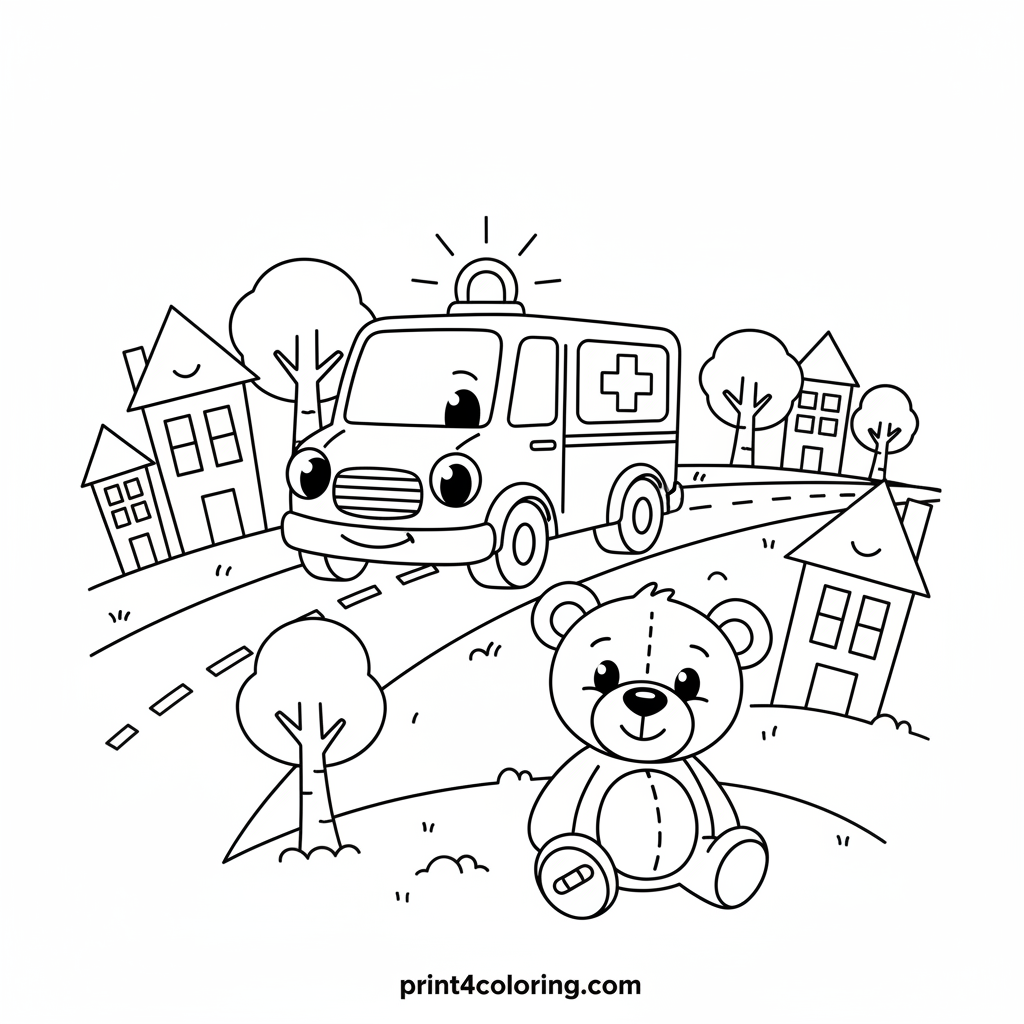 Join our brave ambulance as it speeds along a winding road, siren softly glowing, ready to help! Past happy houses and leafy trees, it's on a special mission to assist a friendly teddy bear who needs a little care. Grab your crayons and add vibrant colors to this heartwarming rescue scene!