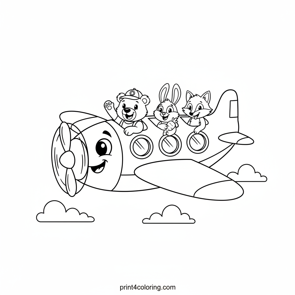 Join a cheerful cartoon airplane on its exciting first flight! With big, friendly eyes and a happy smile, this plane carries adorable animal passengers like a bear, rabbit, and fox, all peeking out to enjoy the clear blue sky. Get ready to add vibrant colors to their amazing airborne journey!
