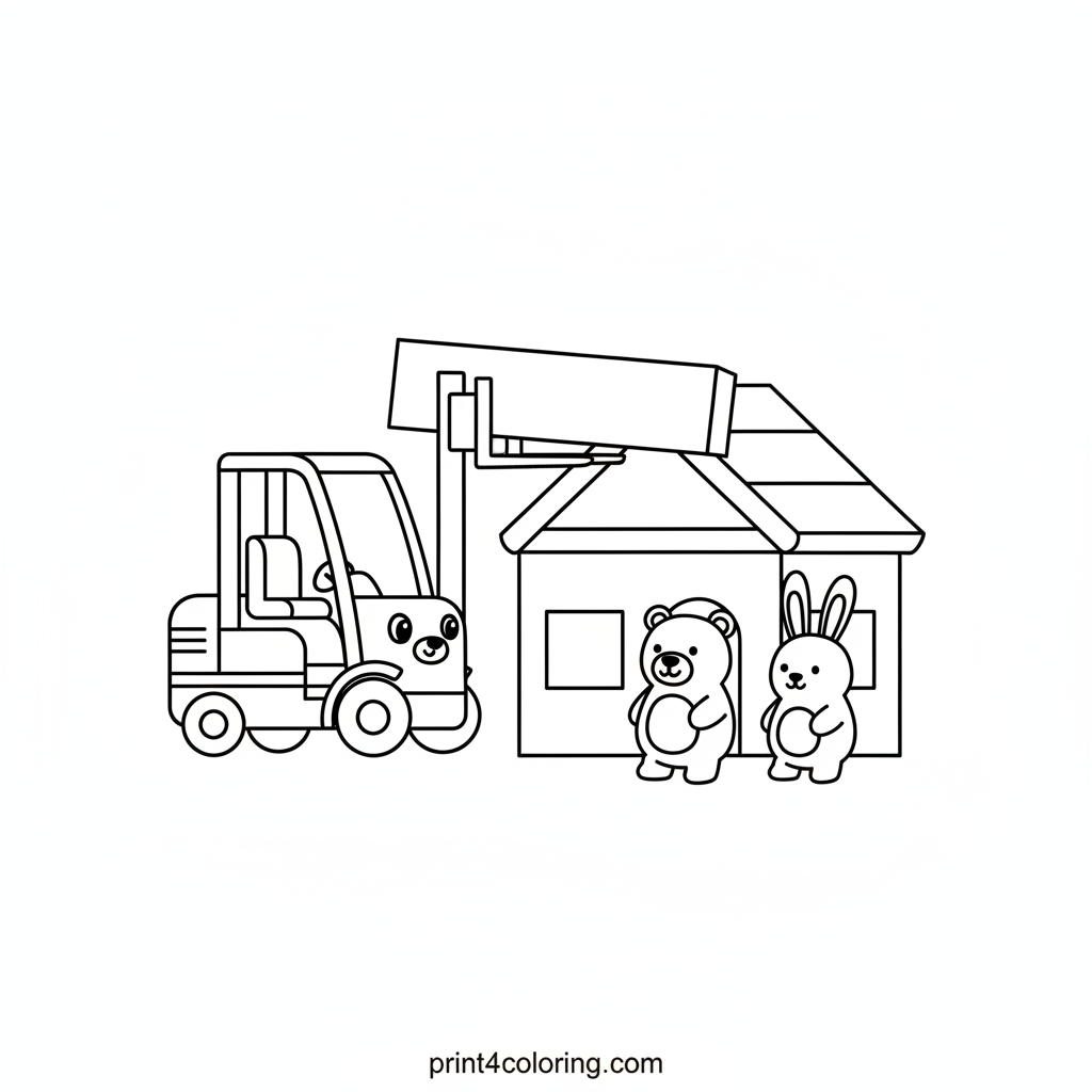 Join a friendly forklift as it helps a cheerful bear and a busy bunny construct their dream playhouse! Watch the forklift carefully lift a colorful roof beam into place, making building fun and exciting. Imagine all the bright colors you can use for their new home and the happy animal friends!