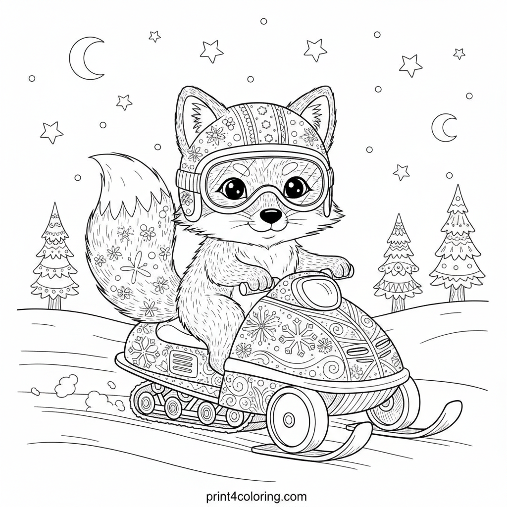 A fluffy arctic fox, snug in its helmet and goggles, steers a charming snowmobile adorned with intricate snowflakes. It glides through soft snow hills and stylized evergreens under a clear, starry winter sky. A detailed, cozy scene awaits your vibrant colors!