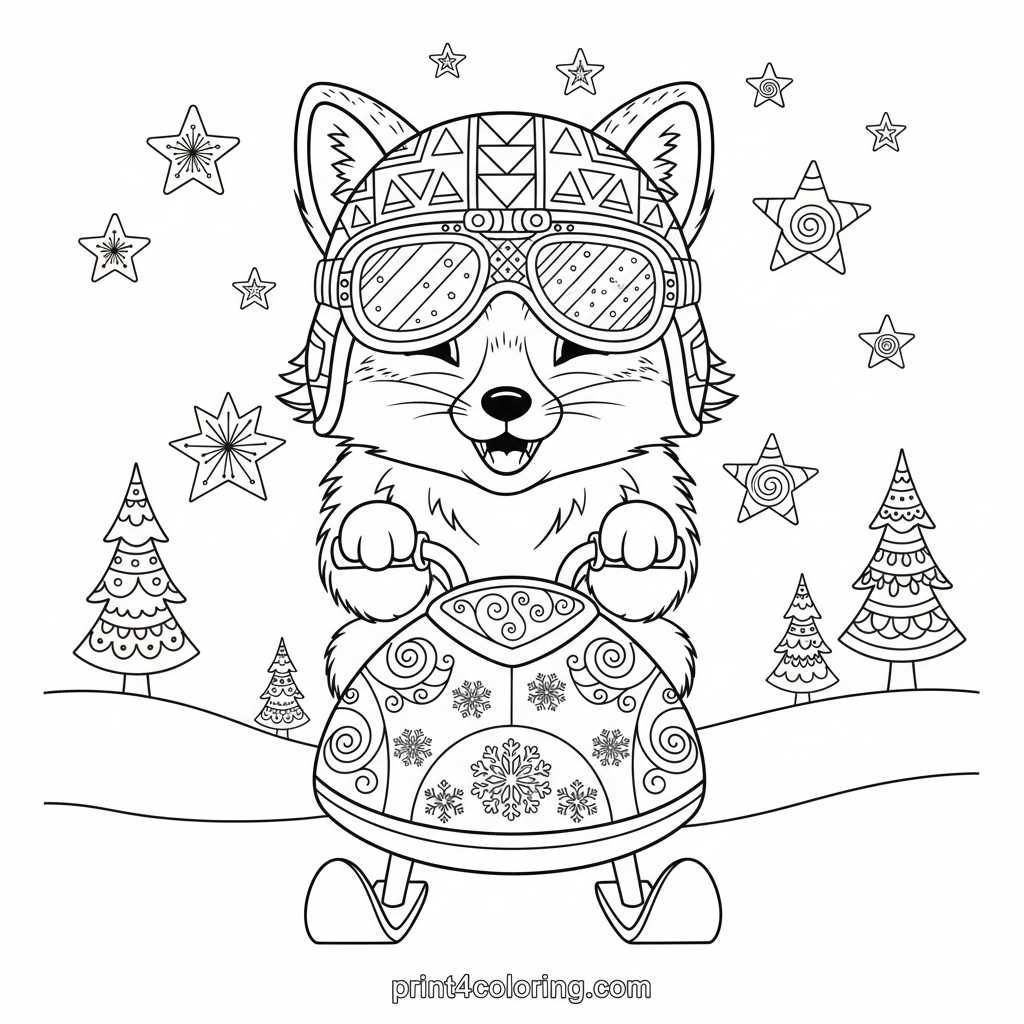 Join a delightful arctic fox on a thrilling snowmobile journey! This cozy fox, wearing a snug helmet and goggles, steers a charming snowmobile adorned with intricate snowflake patterns. Glide through soft snow hills, past stylized evergreens, under a sparkling starry sky. A wonderful winter adventure awaits your colors!