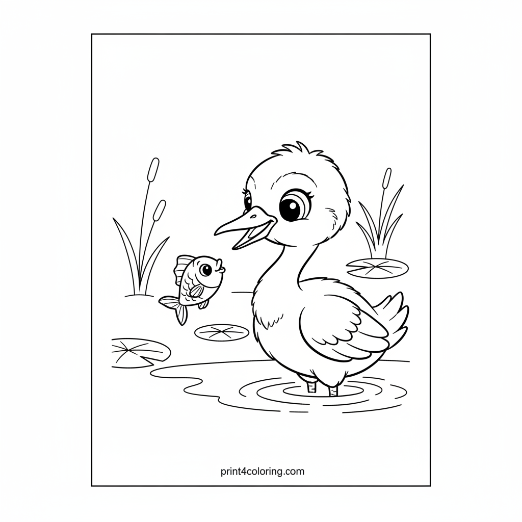 Join a sweet baby crane with big, curious eyes on its very first fishing trip! Watch as it carefully tries to catch a tiny fish in the shallow water, surrounded by tall reeds and beautiful lily pads. A heartwarming scene perfect for young artists to bring to life with their favorite colors.