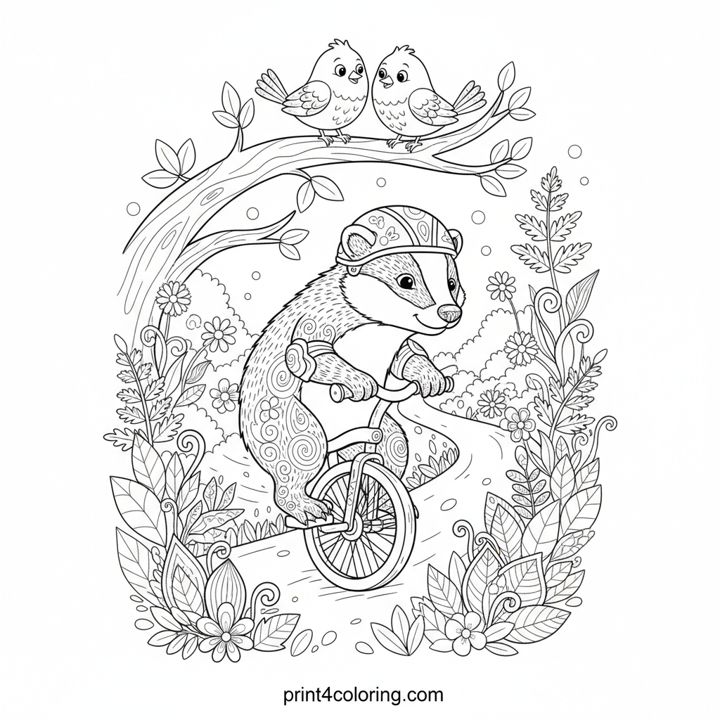 A determined badger, wearing a tiny helmet, carefully pedals a unicycle along a winding forest path. Intricate zentangle leaves, ferns, and wildflowers line the way, while two fluffy birds watch with curiosity. This charming scene offers a delightful challenge for your coloring skills! Get ready to bring this adventurous journey to life with your vibrant colors.