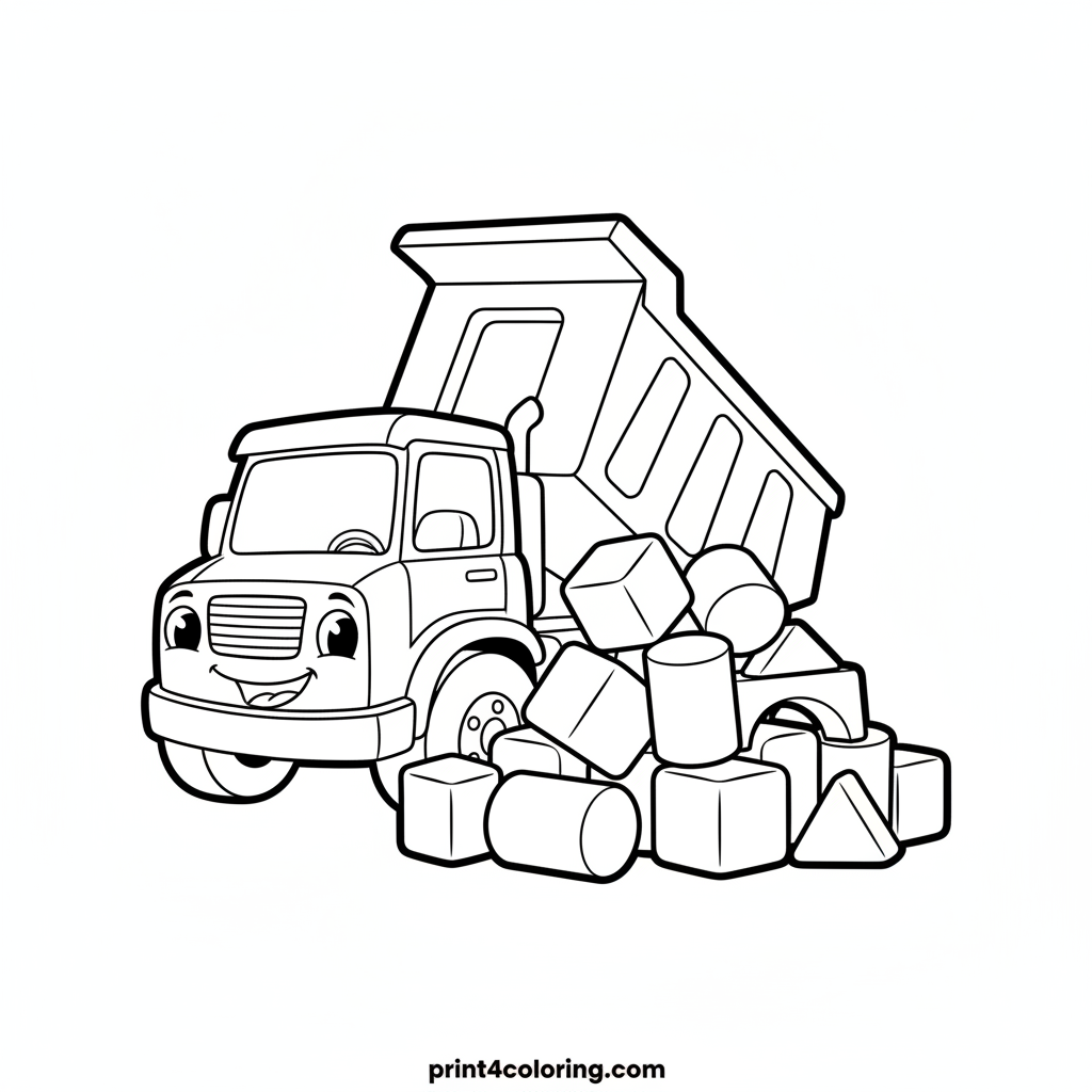 Get ready for a construction adventure! This sturdy dump truck is having a blast, tilting its bed to unload a giant pile of soft, oversized building blocks. Imagine all the towers, castles, and creations you can build with these colorful blocks! A perfect scene for little builders and artists to color and enjoy.