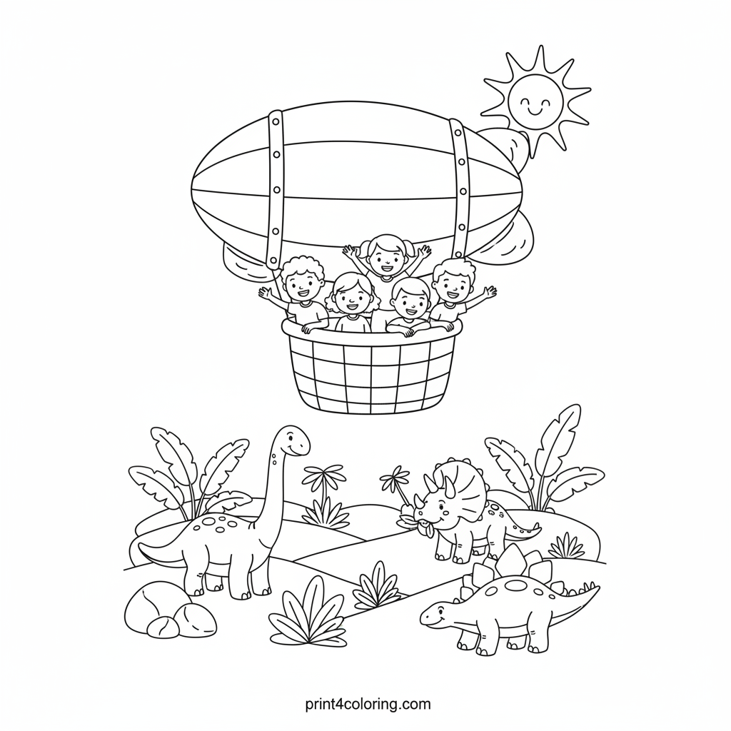 Embark on an amazing journey high above a land lost in time! A sturdy blimp carries adventurous kids, gently floating over a prehistoric landscape. Below, friendly, plant-eating dinosaurs graze peacefully among ancient trees. Get ready to color this exciting sky-high dino discovery!