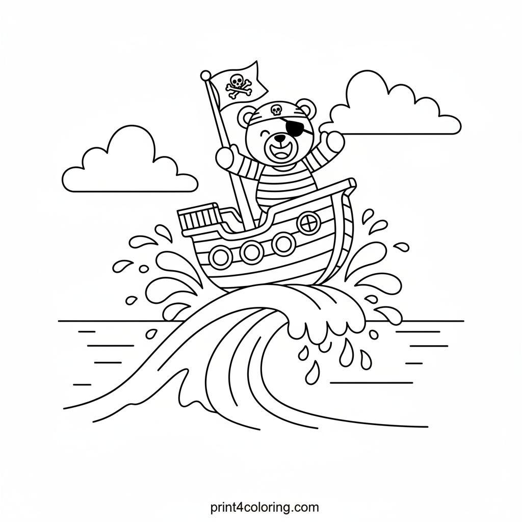 Ahoy, matey! Join our cheerful teddy bear pirate on a thrilling sea adventure. Watch as his lively pirate ship playfully leaps over a gentle, bubbly wave, sending splashes of water high into the air. This fun scene is perfect for little hands to color, bringing joy and imagination to life on the high seas!