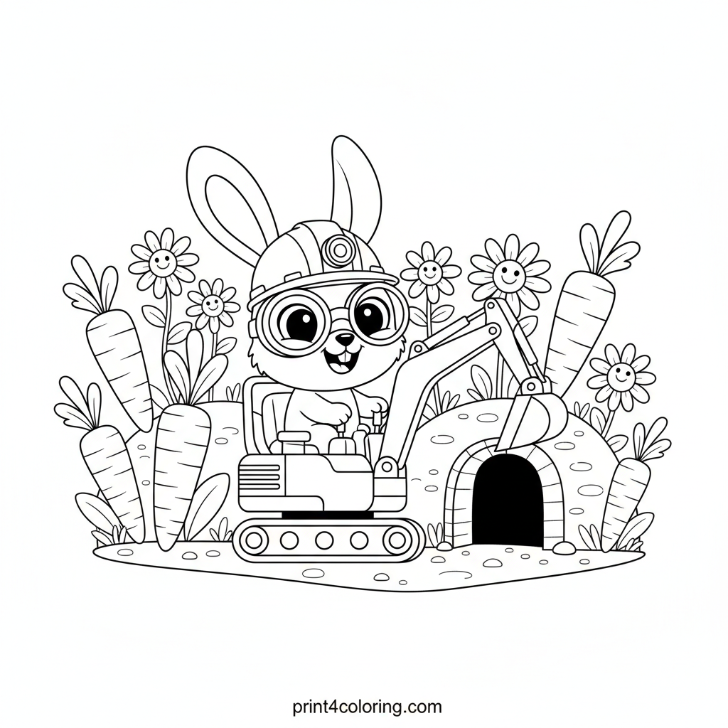 Join our adorable bunny in a tiny construction helmet and goggles as he happily operates a bright yellow mini-excavator! He's digging a super cozy burrow amidst a field of giant carrots and beautiful wildflowers. What colors will you use to bring this busy builder's adventure to life? Get ready for some digging fun!