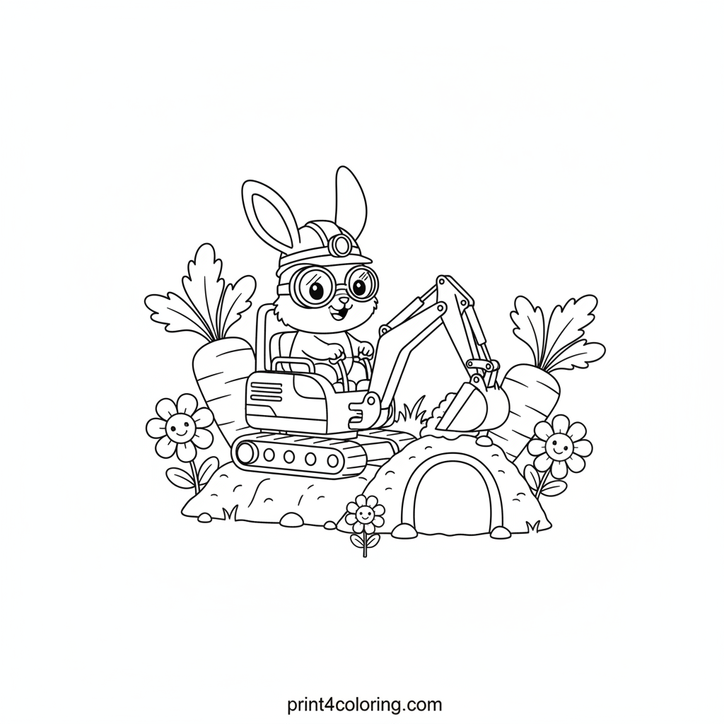 Watch out, world! Our adorable bunny, sporting a tiny helmet and goggles, is hard at work! He's expertly driving a bright yellow mini-excavator, digging a super cozy burrow amidst giant carrots and cheerful wildflowers. Get ready to color this busy construction scene!