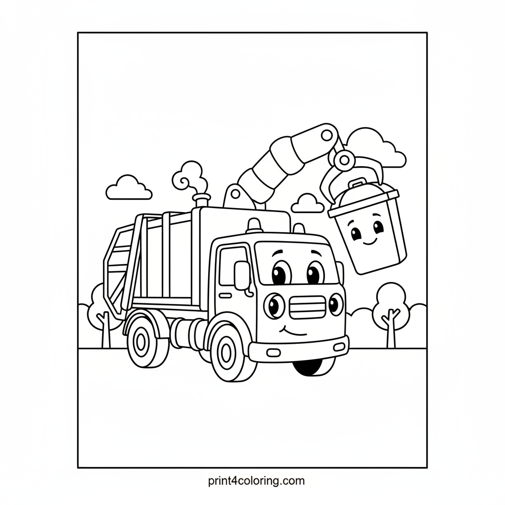 Watch the mighty recycling truck in action! Its powerful compactor arm is gently lifting a bin, ready to collect all the recyclables. Imagine the important job this busy truck does to help keep our planet clean and green. A fun scene for little helpers to color and learn about community heroes!