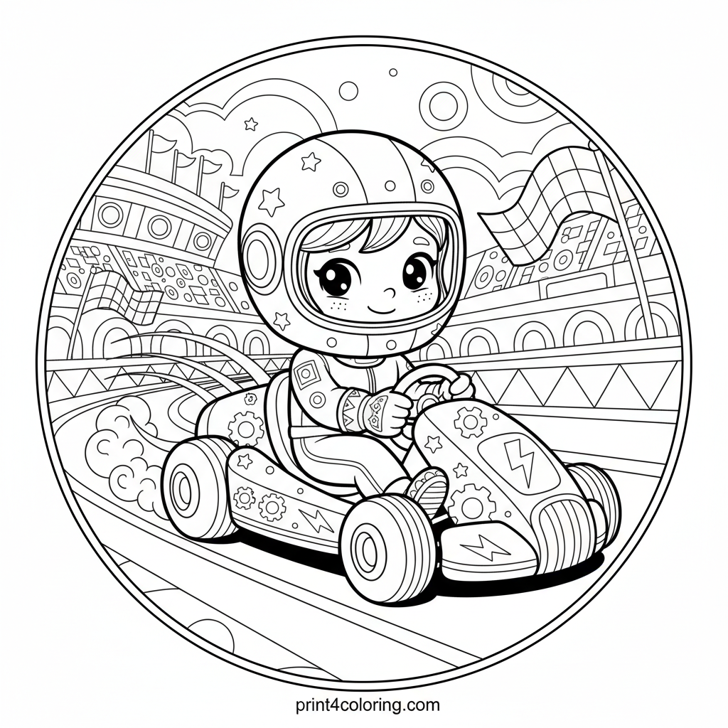 Get ready for an exciting race day! This coloring page features a determined young driver in a sleek go-kart, expertly navigating a curved track. Dynamic lines show incredible speed, with grandstands and checkered flags in the background adding to the thrill. Perfect for aspiring champions who love speed and adventure!
