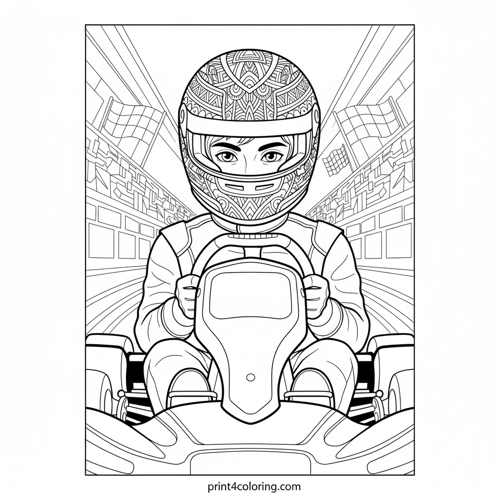 Get ready to color an action-packed race day! This detailed page features a young, focused driver in a sleek go-kart, expertly speeding around a curved track. Dynamic lines show incredible speed, with grandstands and checkered flags in the background, creating an exhilarating scene perfect for aspiring champions.