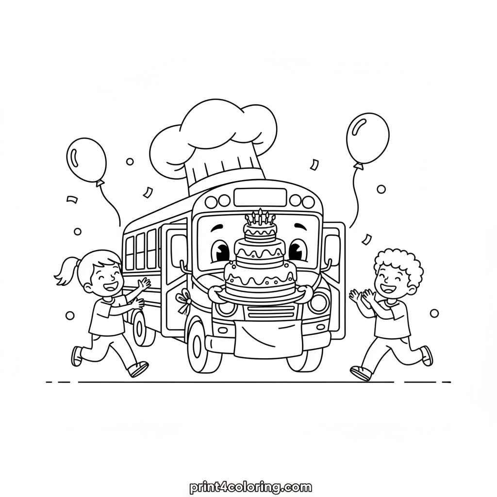 Hop aboard the happiest bus in town! This playful school bus, decked out in a chef's hat and apron, is rolling into a vibrant birthday party, carrying a colossal frosted cake. Kids are cheering with excitement, ready to celebrate! Grab your crayons and add color to this joyful scene.