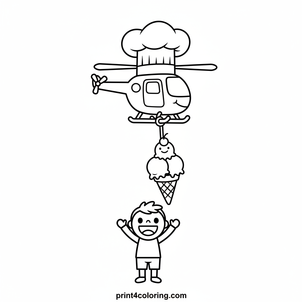 Zoom! Chef Copter is on a special mission, not for rescue, but for dessert! Watch as this heroic helicopter, wearing a tall chef's hat, gently lowers a gigantic, smiling ice cream cone down from its winch. A happy child on the ground eagerly reaches up. Color this yummy, high-flying adventure!