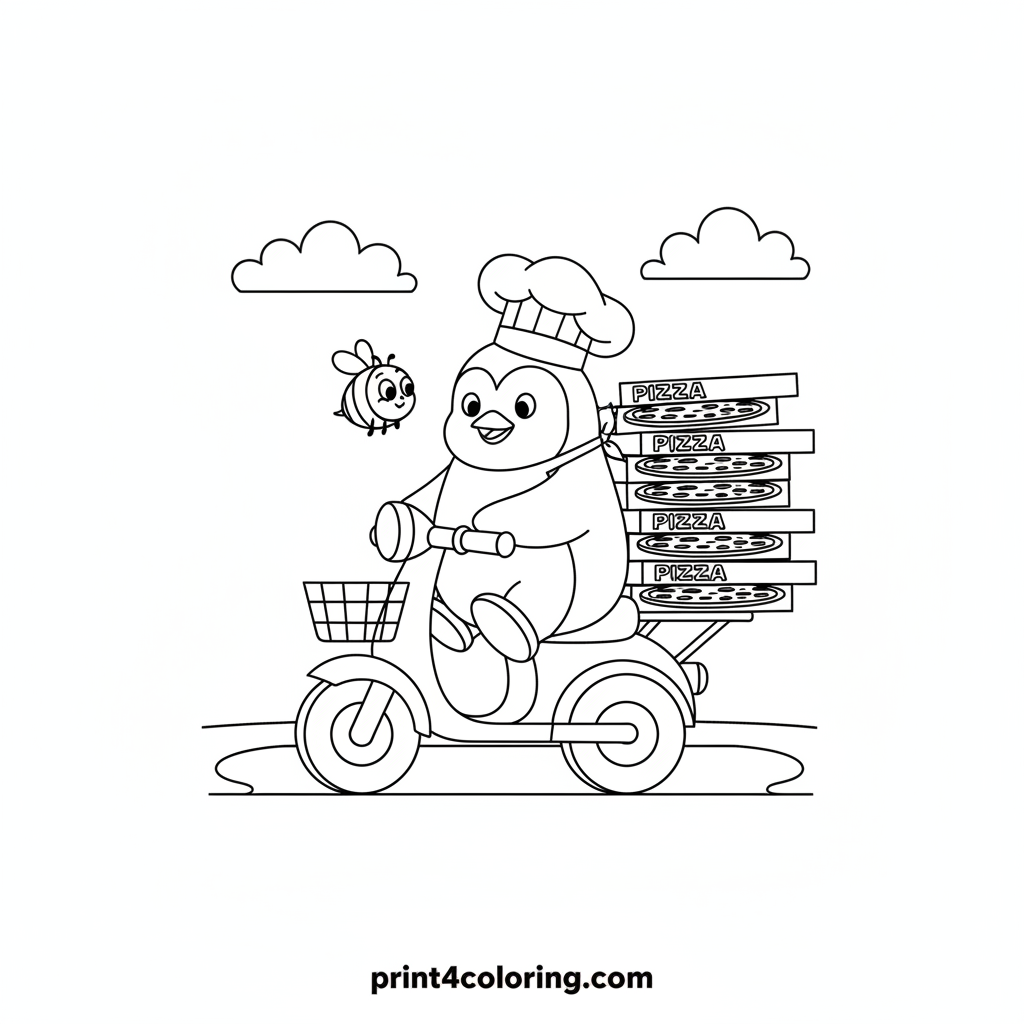 Join a cheerful chef penguin on a wobbly pizza delivery! Watch him carefully balance a stack of delicious pizzas on his bright red scooter. A friendly bumblebee adds to the fun, making his journey a delightful adventure. Get ready to color this determined, pizza-loving penguin and his buzzing friend!