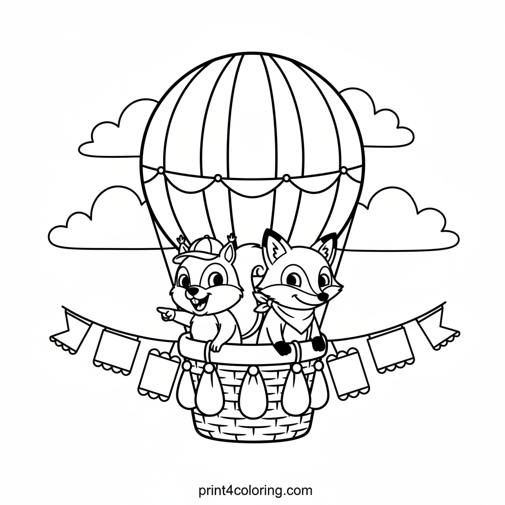 Join a brave squirrel and a clever fox on an amazing sky adventure! They're soaring high above the world in their magnificent striped hot air balloon, navigating through a wonderland of fluffy white clouds. Look closely at the colorful banners fluttering in the breeze as they explore the vast blue sky. Get ready to add vibrant colors to their incredible journey!