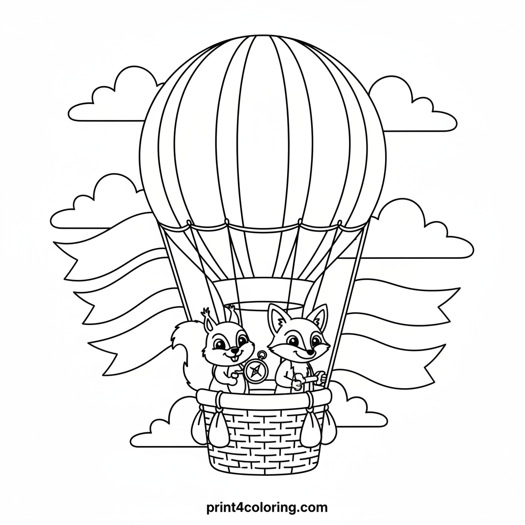 Join a brave squirrel and clever fox on an exciting journey high above the clouds! They navigate their colorful striped hot air balloon through a sky full of big, fluffy clouds and fluttering banners. Imagine the amazing sights they'll see. Get ready to add your favorite colors to this aerial adventure!