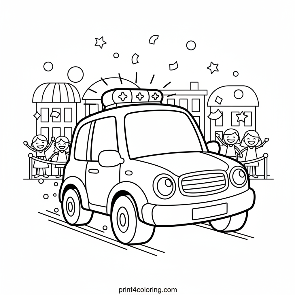 Get ready for a super exciting police car parade! Imagine a brave police car, lights gently flashing, driving through a lively town square. Confetti floats down as it passes by cheering crowds. This dynamic scene celebrates our community heroes, bringing joy and safety to everyone. Grab your crayons and add vibrant colors to this festive event!