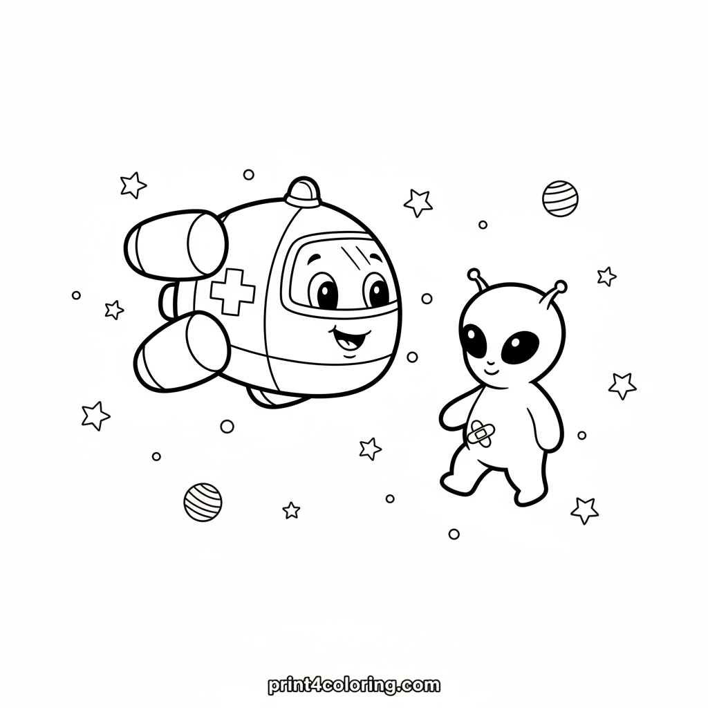 Zoom into a wondrous galaxy where a kind space ambulance, powered by awesome rocket boosters, is on a special mission! Watch as it gently approaches a tiny, smiling alien who needs a colorful bandage for a little scraped knee. Bring this heartwarming space adventure to life with your brightest colors!