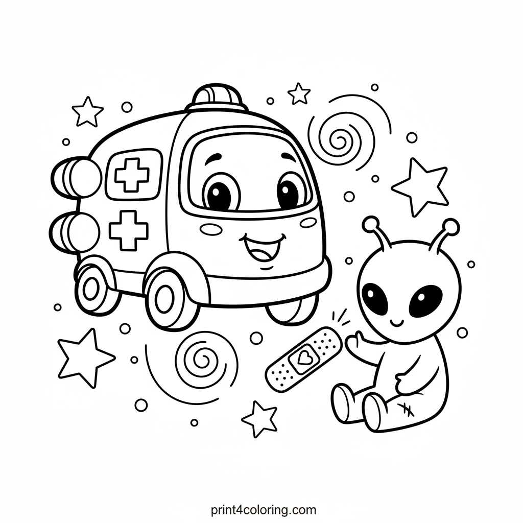 Get ready for a cosmic adventure! A friendly space ambulance with powerful rocket boosters floats through a beautiful, starry galaxy. It's on a special mission to help a tiny, smiling alien who needs a colorful bandage for a scraped knee. Use your brightest colors to bring this stellar rescue to life!