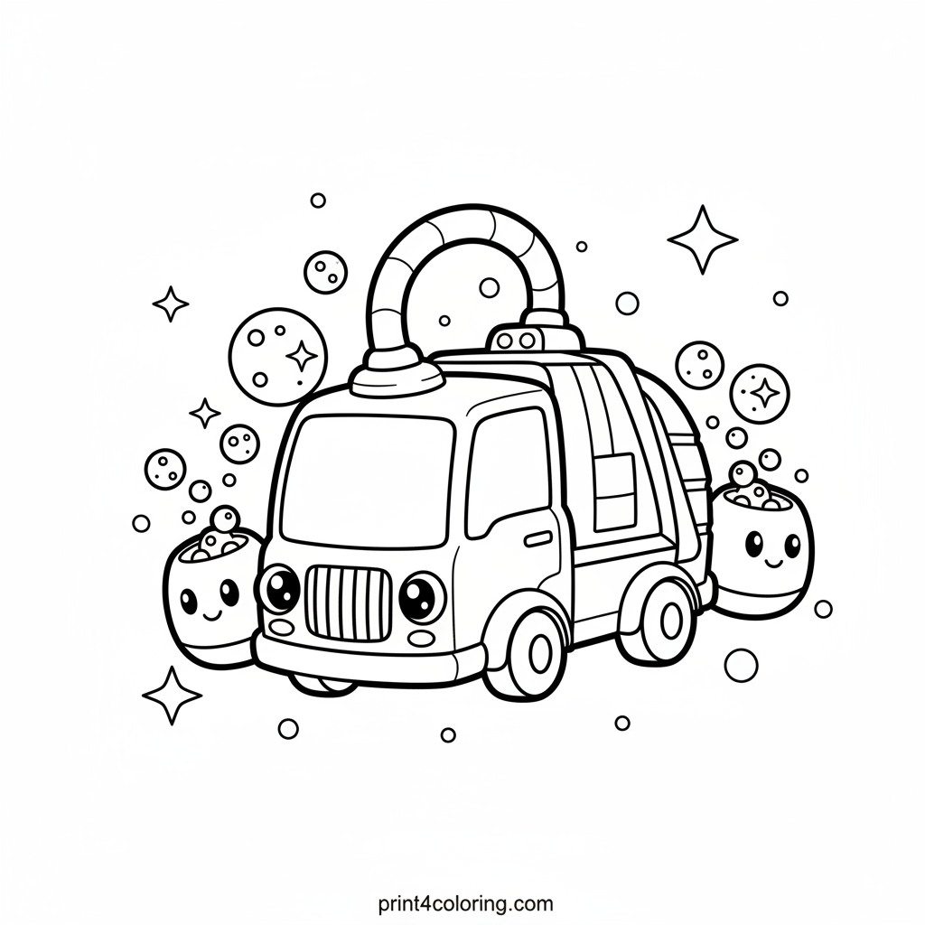 Imagine a future far, far away where a friendly space garbage truck, the Cosmic Cleanup Crew, floats gently among the stars! This special futuristic vehicle uses a super-duper vacuum to collect twinkling stardust from little alien bins, keeping the galaxy tidy and bright. Get ready to add vibrant colors to this amazing interstellar scene!