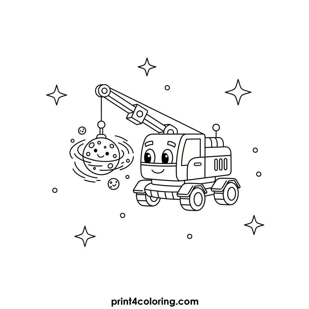 Float into space with our friendly Cosmic Crane! Watch as this futuristic marvel gently glides among twinkling stars, using its special glowing 'wrecking ball' to carefully gather sparkling stardust and tiny, friendly asteroid shapes. Imagine the colorful galaxies you can create as you bring this cosmic scene to life with your crayons and markers!