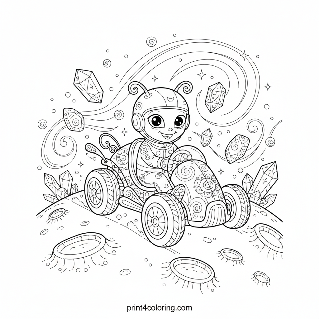 Join a friendly alien explorer on an epic lunar go-kart mission! This futuristic vehicle, with its glowing panels, zips across a magical moonscape. Discover fantastical craters, shimmering crystal formations, and distant, swirling nebulae, all waiting for your vibrant colors. An out-of-this-world adventure awaits!