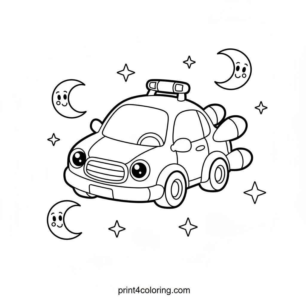 Join our friendly space police cruiser on an amazing stardust ride! This futuristic vehicle, complete with cool rocket boosters, glides peacefully through the vast cosmic sky. Imagine coloring the twinkling stars and crescent moons as it patrols the galaxy, keeping everyone safe. A perfect adventure for young space explorers!
