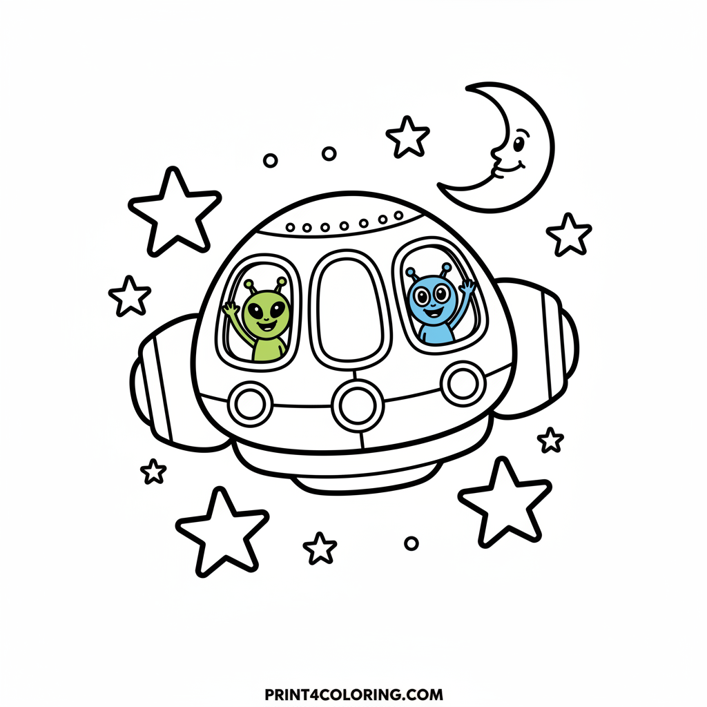 Blast off on an amazing adventure with our friendly starship! See happy alien friends waving from big windows as their rounded spaceship floats gently through a sparkling night sky. Twinkling stars and a peaceful crescent moon surround them, inviting you to add vibrant colors to this cosmic journey. Perfect for young space explorers!