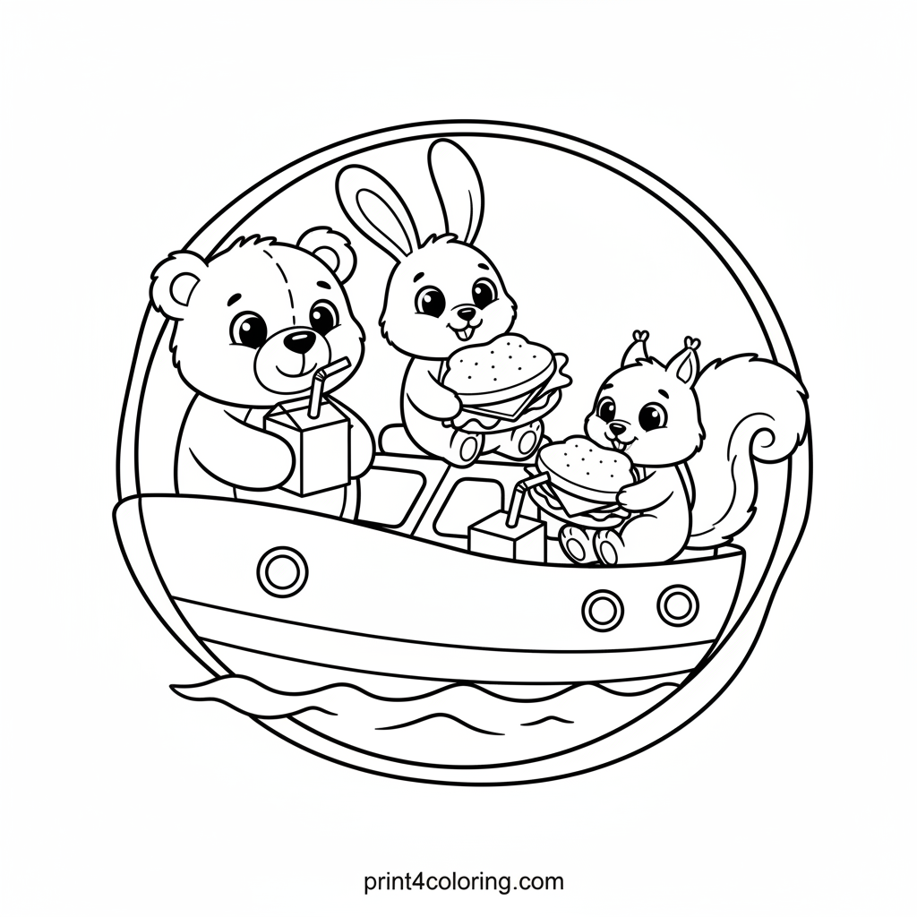 Join a delightful picnic party on a sunny yacht with a happy teddy bear, bunny, and squirrel! They're enjoying oversized sandwiches and refreshing juice boxes. This adorable coloring page invites you to bring their joyful, floating celebration to life with your brightest colors, creating a perfect day out at sea with friends.