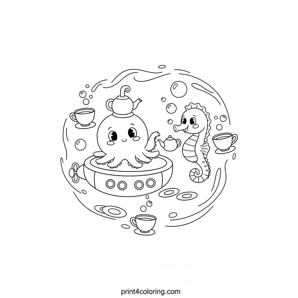 Join a delightful underwater tea party on a cute, cozy submarine! With a teapot-shaped periscope, a polite octopus, and a giggling seahorse enjoy treats and floating teacups. Dive into this whimsical ocean scene and add your favorite colors to bring this charming adventure to life!