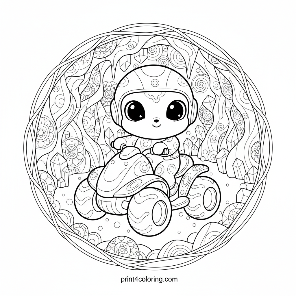Embark on an epic quad bike journey through a dazzling crystal cave! A brave little adventurer pilots a sleek, futuristic quad. The cave walls sparkle with intricate geometric and zentangle-inspired crystals, casting enchanting light and shadows. Get ready to color a magical world of discovery and wonder!